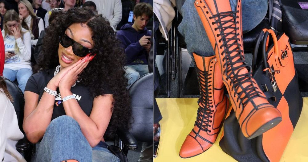 Megan Thee Stallion lit up the Crypto.com Arena on Friday night as she attended the much-anticipated Los Angeles Lakers vs. Dallas Mavericks game. Known for her trendsetting fashion, Megan took her courtside style to new heights with a pair of basketball-orange lace-up stiletto boots that seemed to leap straight out of a bespoke workshop. The boots were crafted from textured leather that perfectly mimicked the grain and color of a basketball, capturing every eye in the venue.